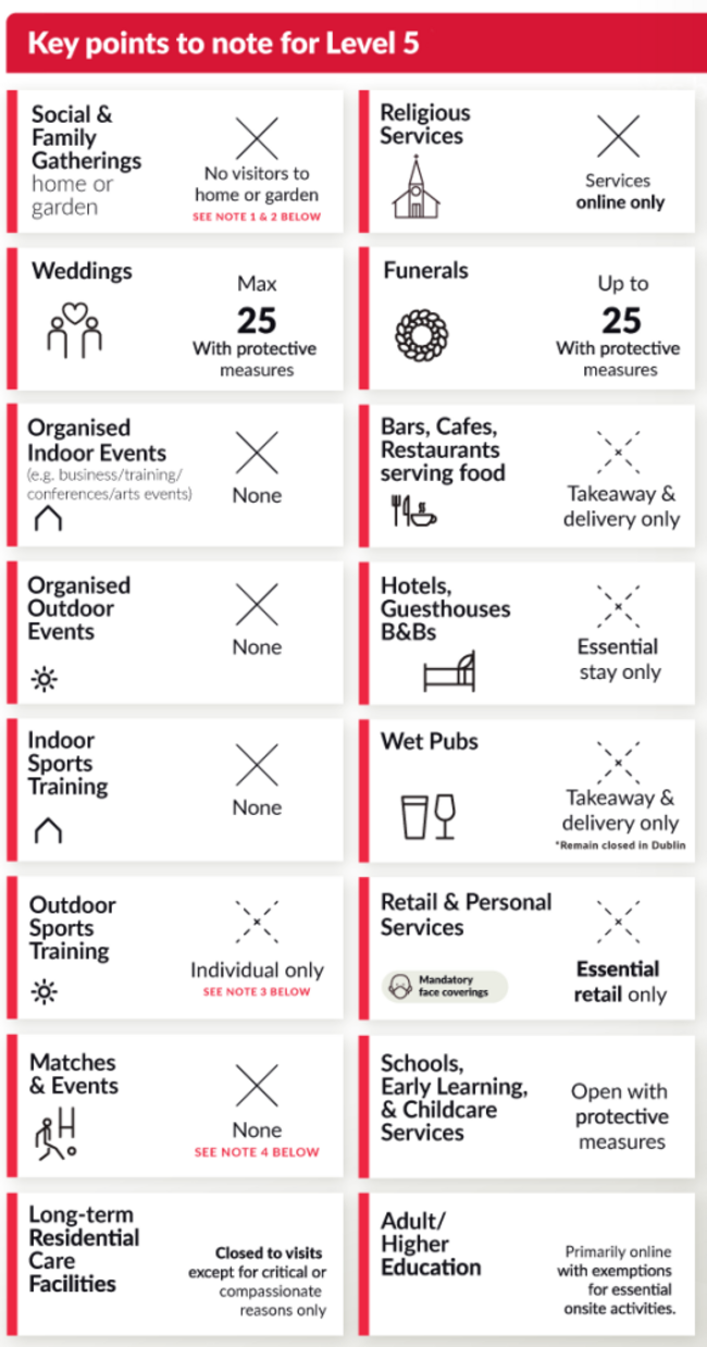 For 6 weeks, Ireland will be at Level 5 of the National Framework for living with Covid-19, the Highest Level of Risk.