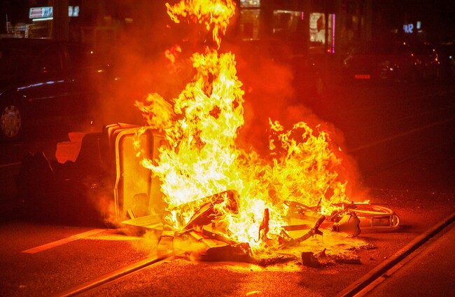 A rubbish container and bicycles are seen burning on the street in The Hague last night. Charles M Vella/SOPA Images/Sipa USA