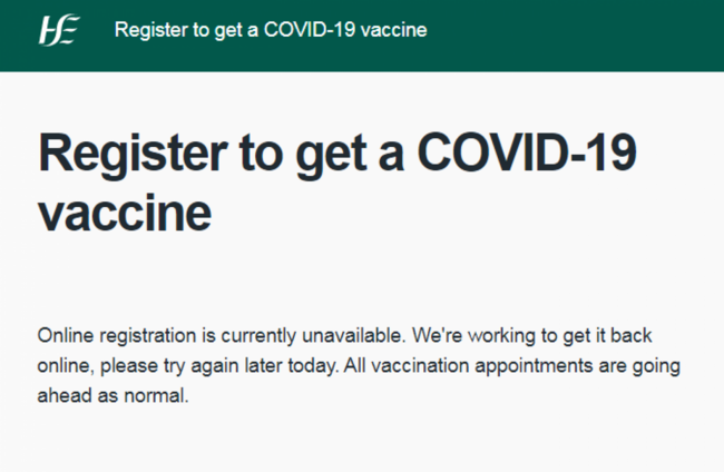 “We are working hard to fix issues. Please try again later,” the HSE said in a statement. Minutes later the online registration site was “back up and running”.
