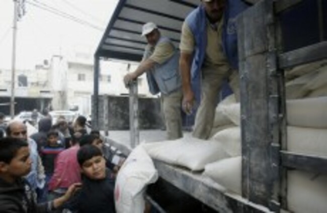 Palestinian refugees receive food aid from the United Nations Relief and Works Agency for Palestine Refugees AP Photo/Mohammed Ballas