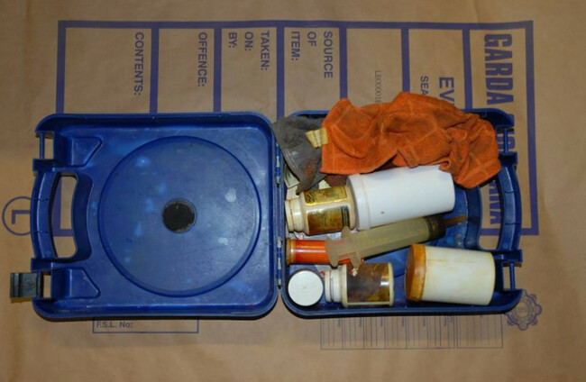 Gardaí seized powdered substances, plastic containers, chemical compounds, a gas mask and face masks.