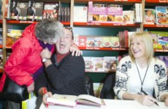 Mary Connor from Dun Laoghaire gives Brendan O'Carroll a kiss in Eason O'Connell Street. Leon Farrell/Photocall Ireland