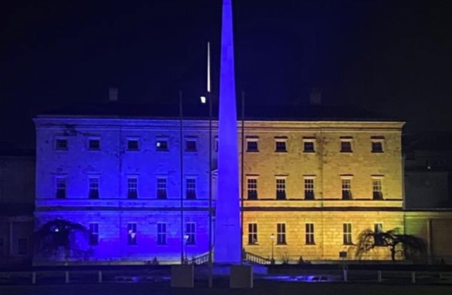 Leinster House illuminated in blue and yellow representing the Ukrainian flag. Oireachtas