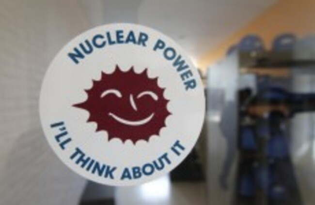 A sticker is taped on a glass door at the nuclear plant in Tihange, Southeast of Brussels, Wednesday, March 16, 2011. AP Photo/Yves Logghe