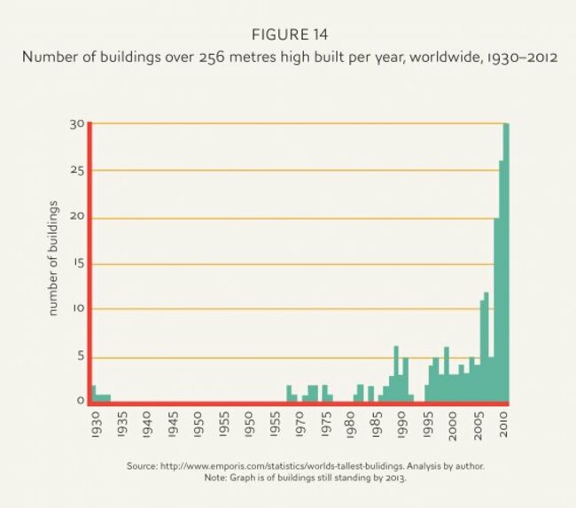 Because of the length of time that it takes to build a skyscraper, their construction straddles the boom and bust periods - a construction on a skyscraper might begin in the boom time, but as we can see from the 1929 example, construction peaked just afterwards in the early 30's. While 1929 and the present day situation are quite different, it still doesn't look good.