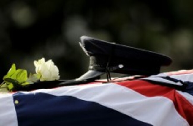The hat and gloves of murdered prison officer David Black are placed on his coffin during his funeral service at Molesworth Presbyterian Chuch in Cookstown, Northern Ireland Peter Morrison/AP/Press Association Images