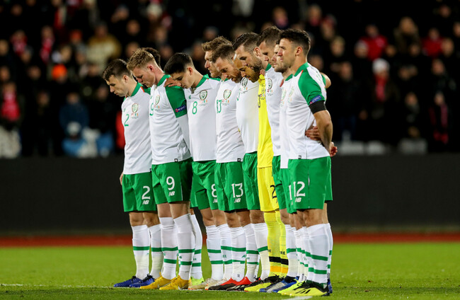 The Ireland team observe a silence ahead of the game with Denmark in tribute to 30 year-old David Clerkin. Ryan Byrne/INPHO