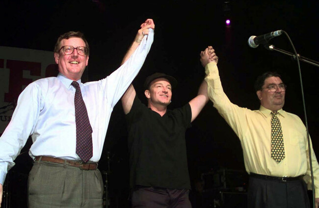 U2 rock star Bono is flanked by David Trimble (left) and John Hume on stage during a special concert in Belfast to promote the "Yes" vote in the peace referendum in Northern Ireland. PA