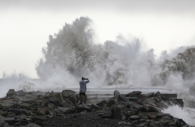 A man takes a snapshot of the waves hitting the breakwater in Barcelona, Spain Joan Mateu via PA Images