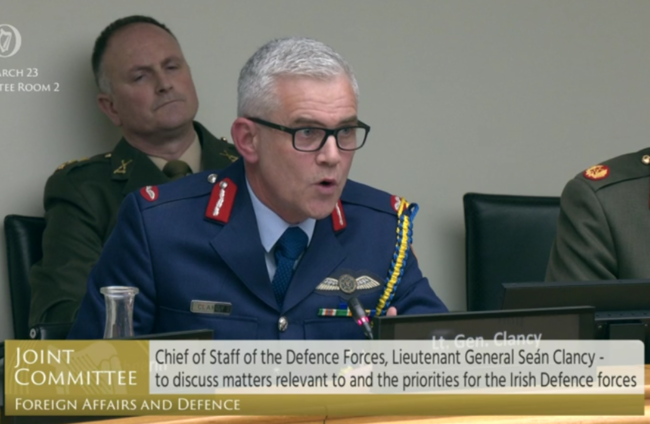 Chief of Staff of the Irish Defence Forces Lt General Seán Clancy speaking to the committee. Oireachtas