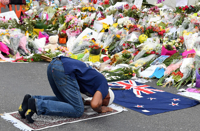 A muslim worshipper prays at a makeshift memorial at the Al Noor Mosque on Deans Rd in Christchurch, New Zealand AAP/PA Images
