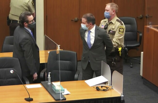 Former Minneapolis police Officer Derek Chauvin is taken into custody as his attorney, Eric Nelson, left, looks on AP/PA Images