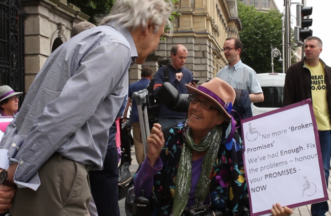 The protesters say the government has failed to live up to previous promises – including the proposed personalised budget in the 2011 Fine Gael manifesto that would help with independent living.