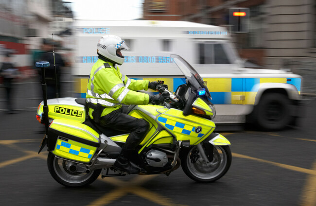 File image of PSNI officer on a motorcycle driving through Belfast. Alamy Stock Photo