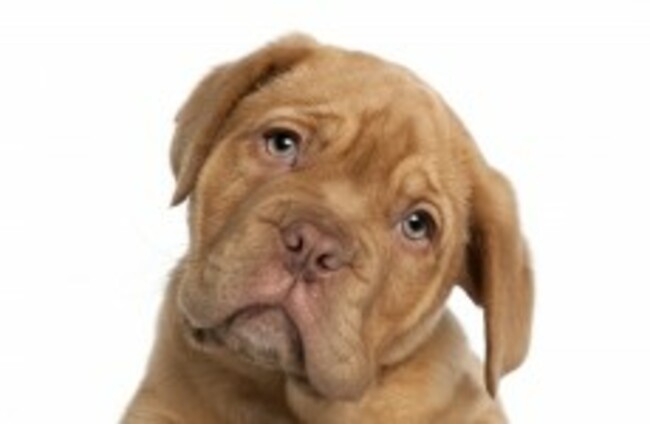 Dogue de Bordeaux puppy, 10 weeks old, lying in front of white background. via Shutterstock