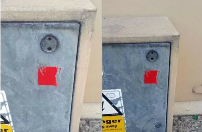 The colour of the sticker is used to record when the mini pillar was inspected, with red, blue, green and yellow having been used in recent years.