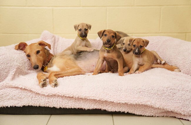 Rainbow the lurcher with her four puppies Fran Veale
