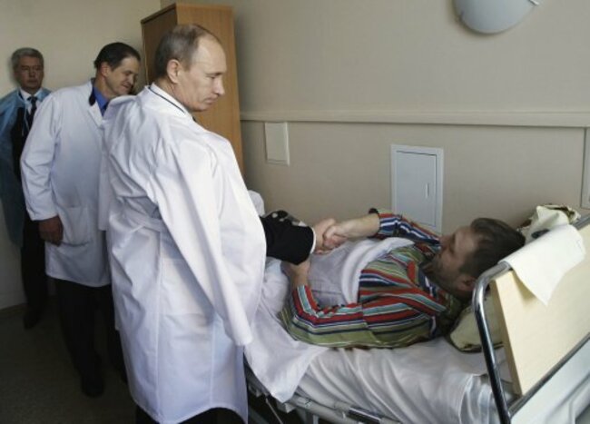 [caption id="attachment_75841" align="alignnone" width="512" caption="Russian Prime Minister Vladimir Putin speaks to a person injured in the bombing at Domodedovo Airport as he visits the Vishnevsky hospital, Moscow, on 25 January, 2011. (AP Photo/RIA Novosti, Alexei Nikolsky, Pool)"][/caption]