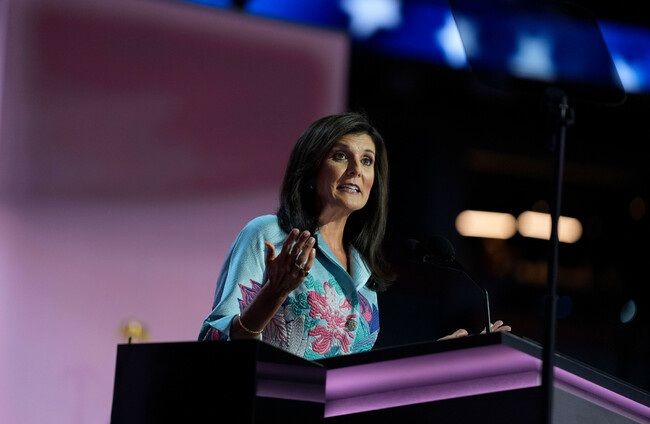 Nikki Haley speaking at the RNC yesterday. Alamy Stock Photo