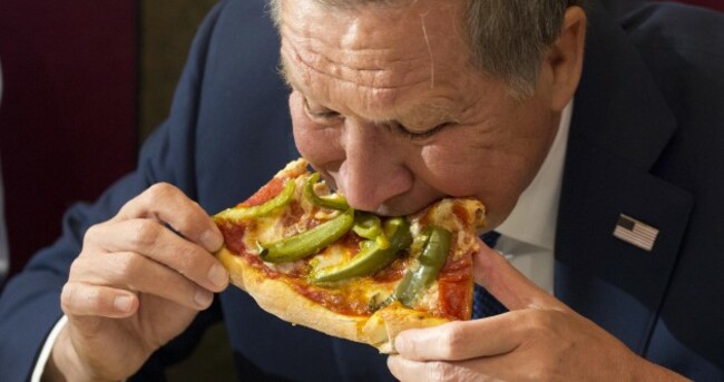 Kasich eats pizza at Gino's Pizzeria in Queens, New York last week.