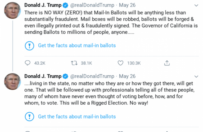 Twitter tagged two of his tweets in which he claimed that more mail-in voting would lead to what he called a “Rigged Election” this November.