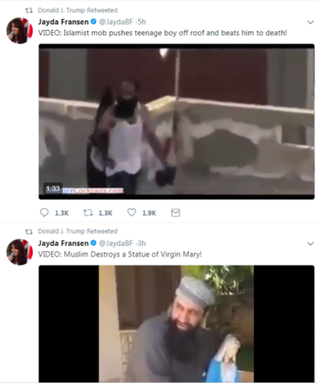 The videos had been tweeted out by deputy leader of far-right Britain First, Jayda Fransen. The first, claims to show a Muslim migrant assaulting a Dutch boy who is on crutches.