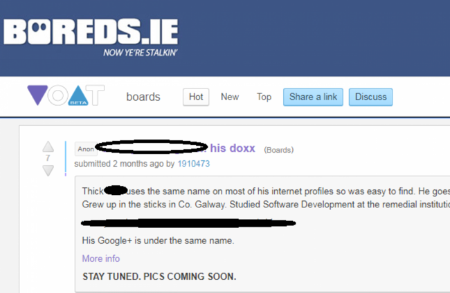 In one instance seen by TheJournal.ie, internet users posted details of one Boards.ie user on another online forum. The user mocked up the official Boards.ie logo and subdeck which, when altered, read: “Boreds.ie/Now Ye’re Stalkin’”. This is a play on the real slogan of Boards.ie, which is “Now ye’re talkin’”.