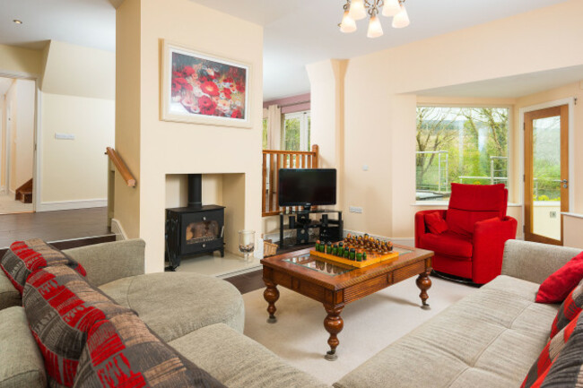 There is a sitting room with a tiled floor and a solid fuel stove. The swimming pool can be accessed from this room.
