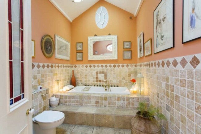 The main bathroom has a raised pedestal bath, marble tile and a double-height ceiling.