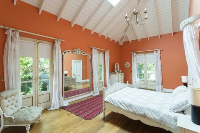The master bedroom has three sets of French doors leading to a decking area overlooking the nearby mountain stream. It also has an en-suite with marble tile and worktops.