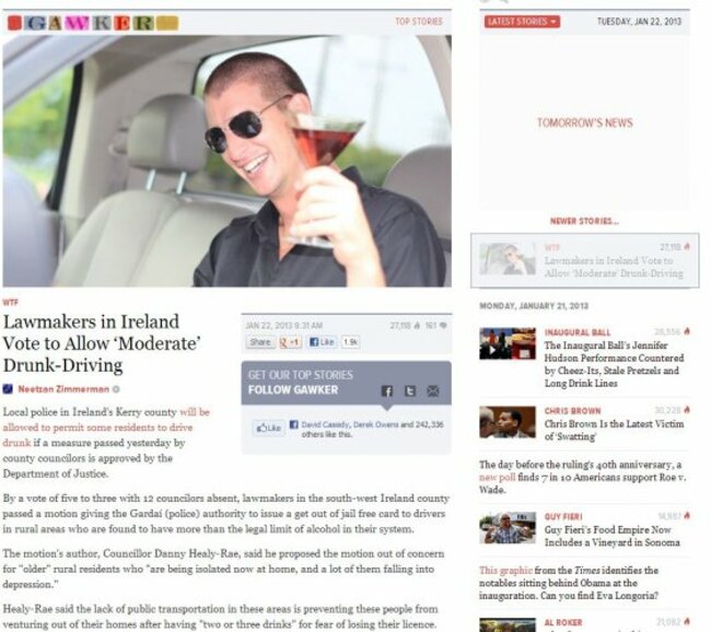 Gawker illustrated its article with an atypical image of a drink driver in rural Ireland: