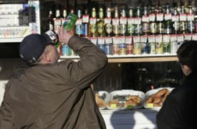 File: A Russian man drinks from a bottle standing in front of a liquor booth in a street in Moscow AP/Press Association Images