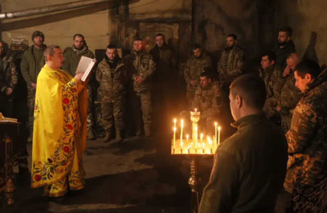 Chaplain Ivan of the Orthodox Church of Ukraine reads a prayer for Ukrainian servicemen near Vuhledar AP Photo/Valentyn Kuzan/PA Images