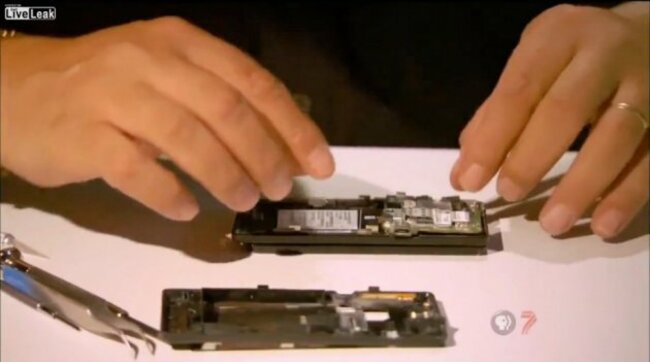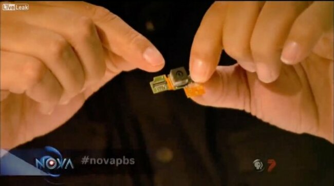 The camera fits inside this pod, which gets attached to the belly of a UAV. Permission to show a photo of the camera itself was not granted to PBS.