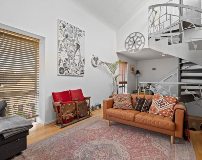 Upstairs, the property opens into a dramatic open plan living and kitchen space. With an approximate 20-foot ceiling height, the room is flooded with natural light, creating an airy, loft-style atmosphere rarely found in homes in the city centre. Despite its central address, the elevated living space feels unexpectedly calm despite the bustling streets below.