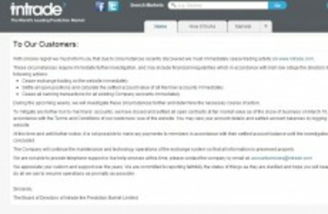 Dublin based betting website Intrade ceases trading