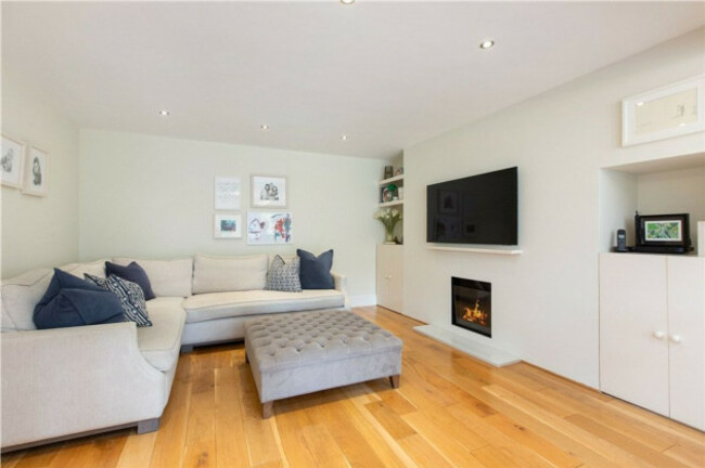 The bespoke kitchen features stone worktops, a Smeg oven, American-style fridge-freezer, five-ring gas hob and generous storage, all enhanced by solid oak flooring and a breakfast bar perfect for casual dining. A seamlessly connected family room offers built-in shelving, an electric fireplace and direct views onto the garden to combine comfort and practicality.