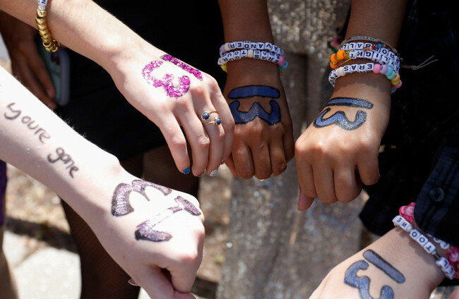 Fans showing off their hand art and beads ahead of a Taylor Swift Eras Tour concert last year. Alamy Stock Photo