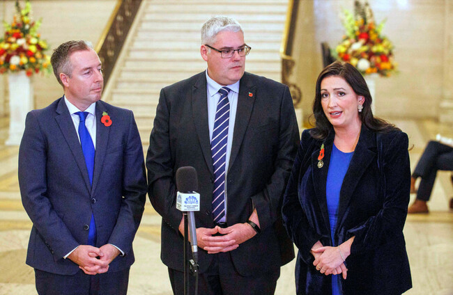 (left to right) Education Minister Paul Givan, DUP leader Gavin Robinson MP and deputy First Minister Emma Little-Pengelly Alamy