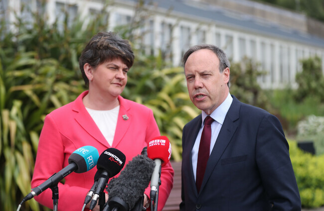 DUP leader Arlene Foster and Nigel Dodds speak to the media at Stormont Castle in Belfast. Niall Carson via PA Images