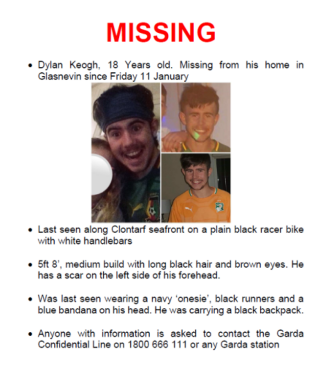 18-year-old Dylan Keogh went missing from his home in Glasnevin on 11 January.  He was last seen in the Clontarf area between 9.30pm and 10.30pm that day.