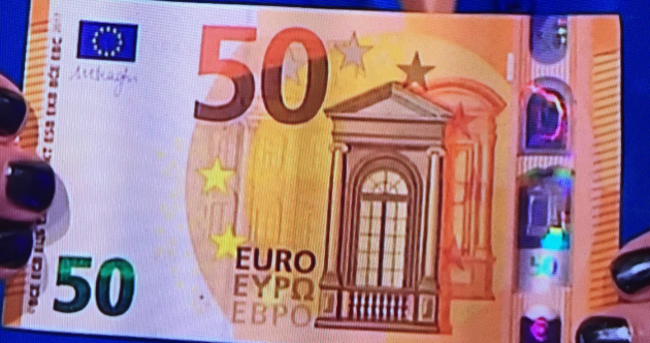 And if you tilt the banknote, the silvery stripe reveals a portrait of Europa in a transparent window and the emerald number displays an effect of the light that moves up and down.