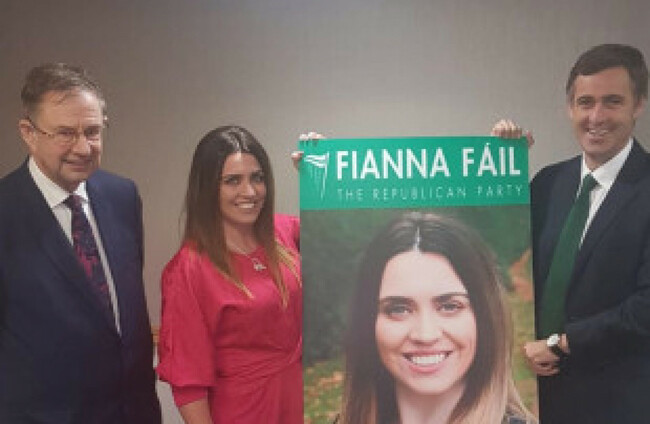 Standing next to TD Éamon Ó Cuív, the spokesperson on Regional Development, Rural Affairs and the Gaeltacht, as well as Senator Mark Daly, McAnespy is holding a photo of herself with the Fianna Fail branding. The two announced themselves as the directors of McAnespy’s campaign.