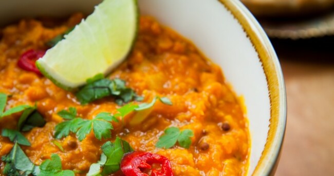 Add a pinch of ground red chilli, a teaspoon ground turmeric and three teaspoons garam masala. Cook for 30 seconds, then add 225g red split lentils, a 400g tin chopped tomatoes, sprinkle with salt and add around a litre of water. Tip in 1kg of mixed chopped veg – eg carrot, courgette, cauliflower, pumpkin, parsnip, the more colourful the better! – reduce heat and simmer, covered, for 15-20 minutes until the vegetables and lentils are cooked. Stir in two handfuls of fresh spinach leaves and season to taste. Serve on steamed rice, topped with chopped coriander leaves, natural yoghurt and lime quarters.
