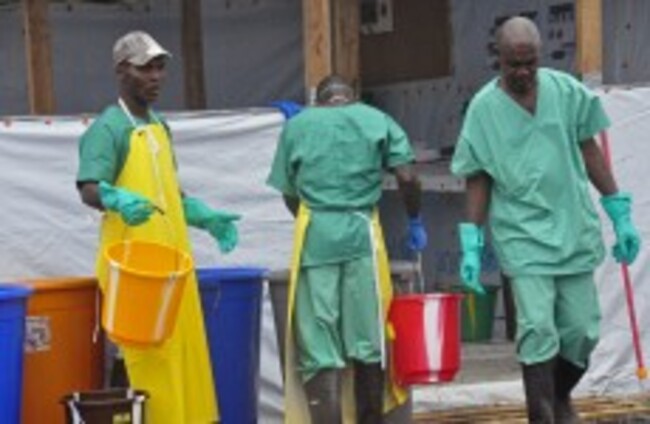 Health workers with buckets, as part of their Ebola virus prevention protective gear, at an Ebola treatment center in the city of Monrovia, Liberia. AP/Press Association Images