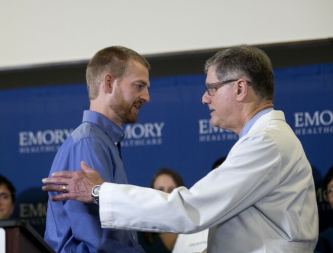 Ebola victim Dr Kent Brantly (left) after being released from Emory University Hospital, Atlanta, yesterday.