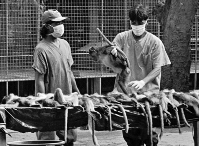 File photo: Jan 1997… Government veterinarians line up dead monkeys after administering lethal injections at a farm near Manila. More than 600 monkeys in the farm were ordered killed following the discovery of an Ebola virus strain from two of them which were shipped to the US for scientific research.