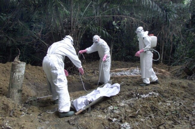 File photo: December 2001… Workers wearing protective clothing bury five-year old Adamou, next to the graves of other Ebola victims in a cemetry in Mekambo, north eastern Gabon, following an outbreak.