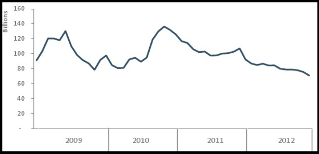 Having reached its peak immediately after the bailout November 2010 (at 26.5 per cent), the share of the total ECB funding by banks has declined, forming just 6.3 per cent in December 2012.