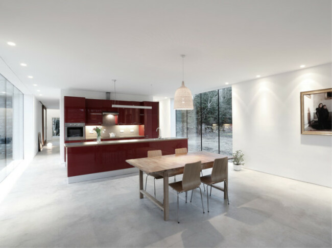 Stark white finishes, floor to ceiling glazing, recessed lights and polished concrete floors throughout combine to create a modern, calm and light-filled home.